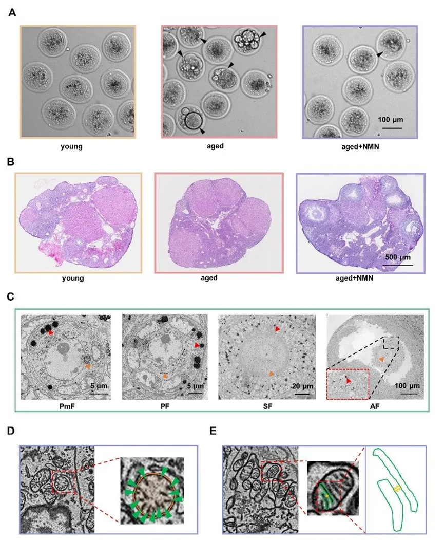从(A)促排卵母细胞质量和(B)卵巢中不同发育阶段卵泡数量等角度对不同组小鼠的卵巢储备情况进行了研究。结合扫描电镜下不同发育阶段卵泡中脂滴(C)和线粒体(D和E)特征的变化,进一步揭示卵巢健康状态并探索NMN作用机制。